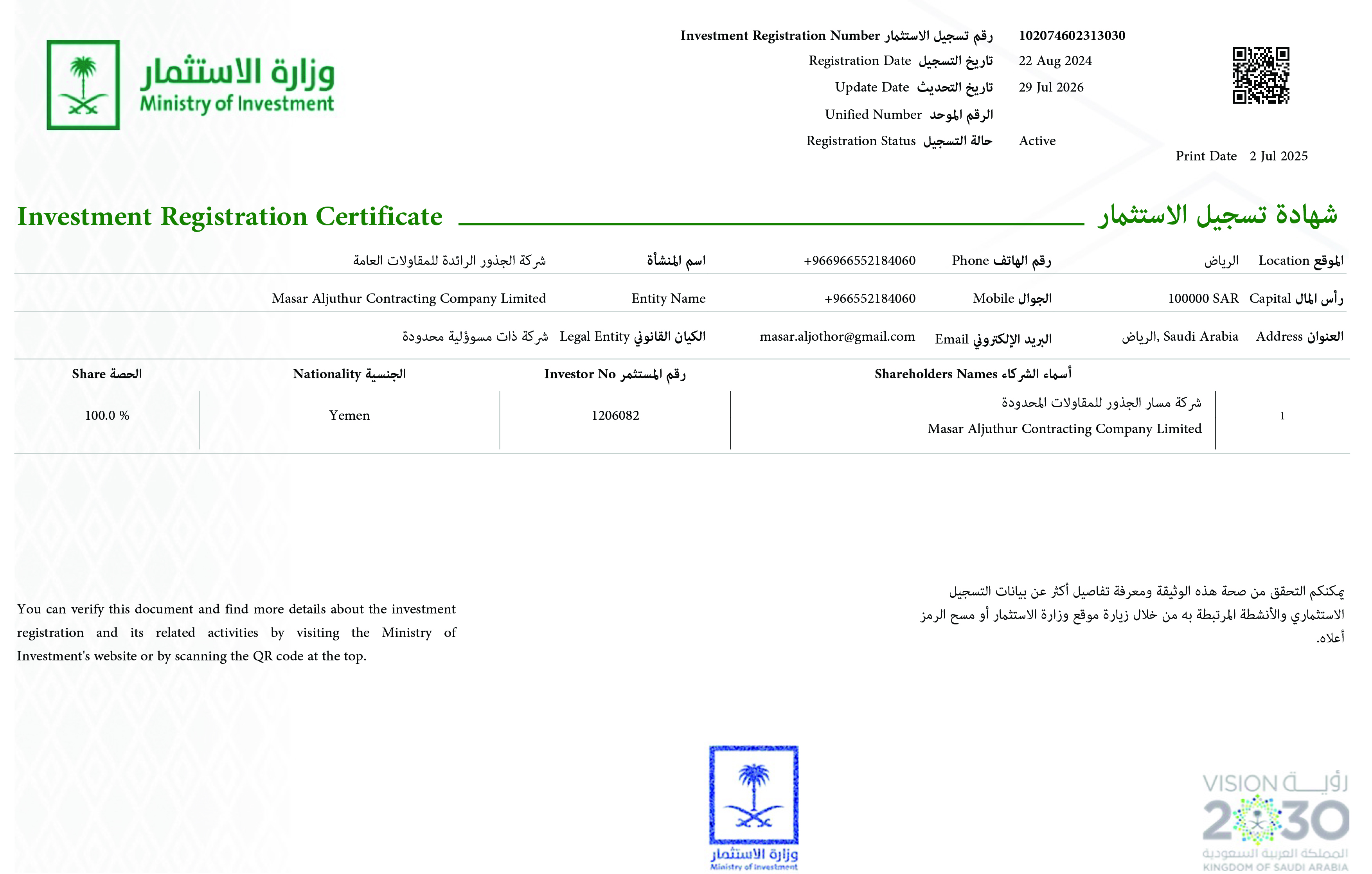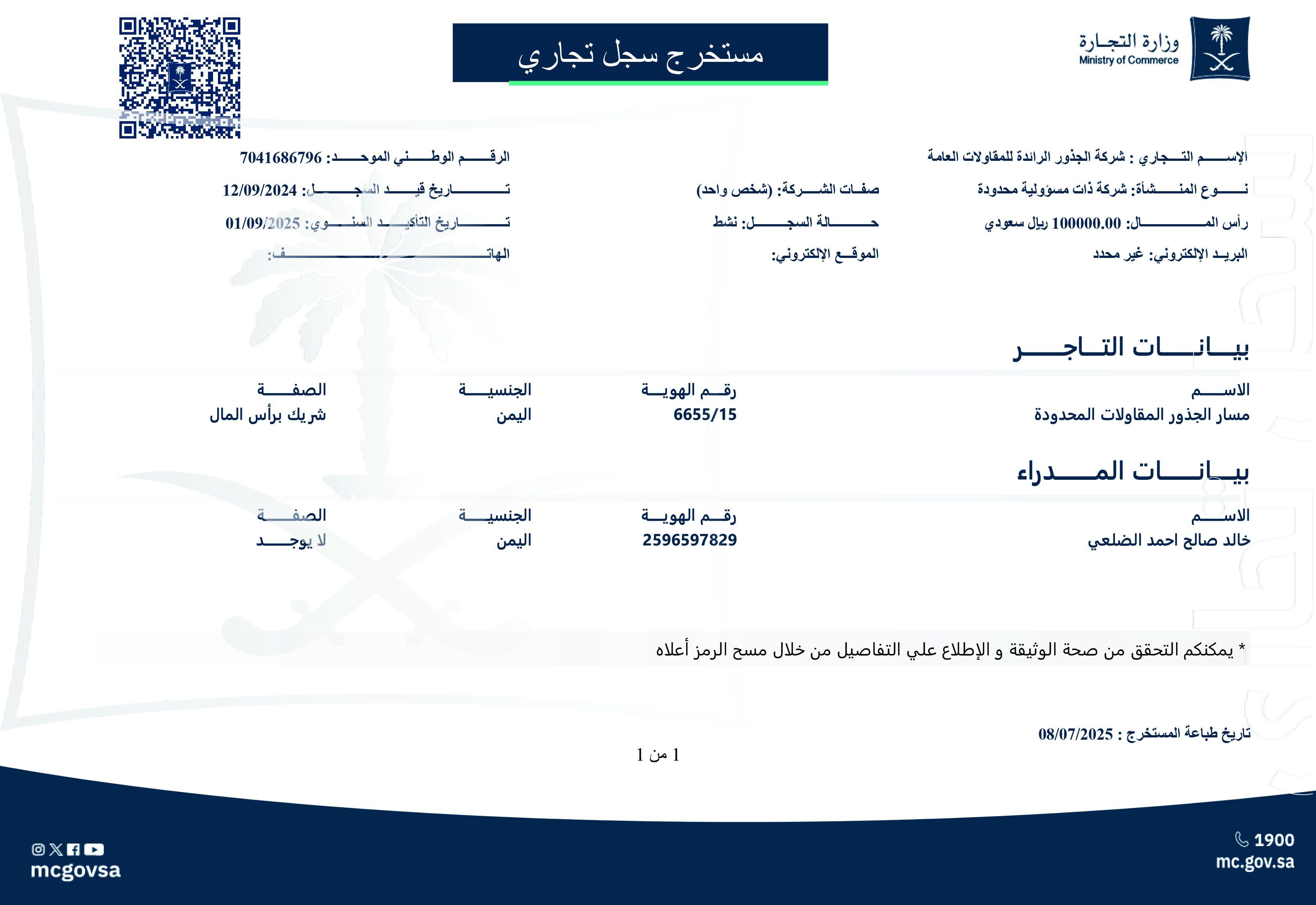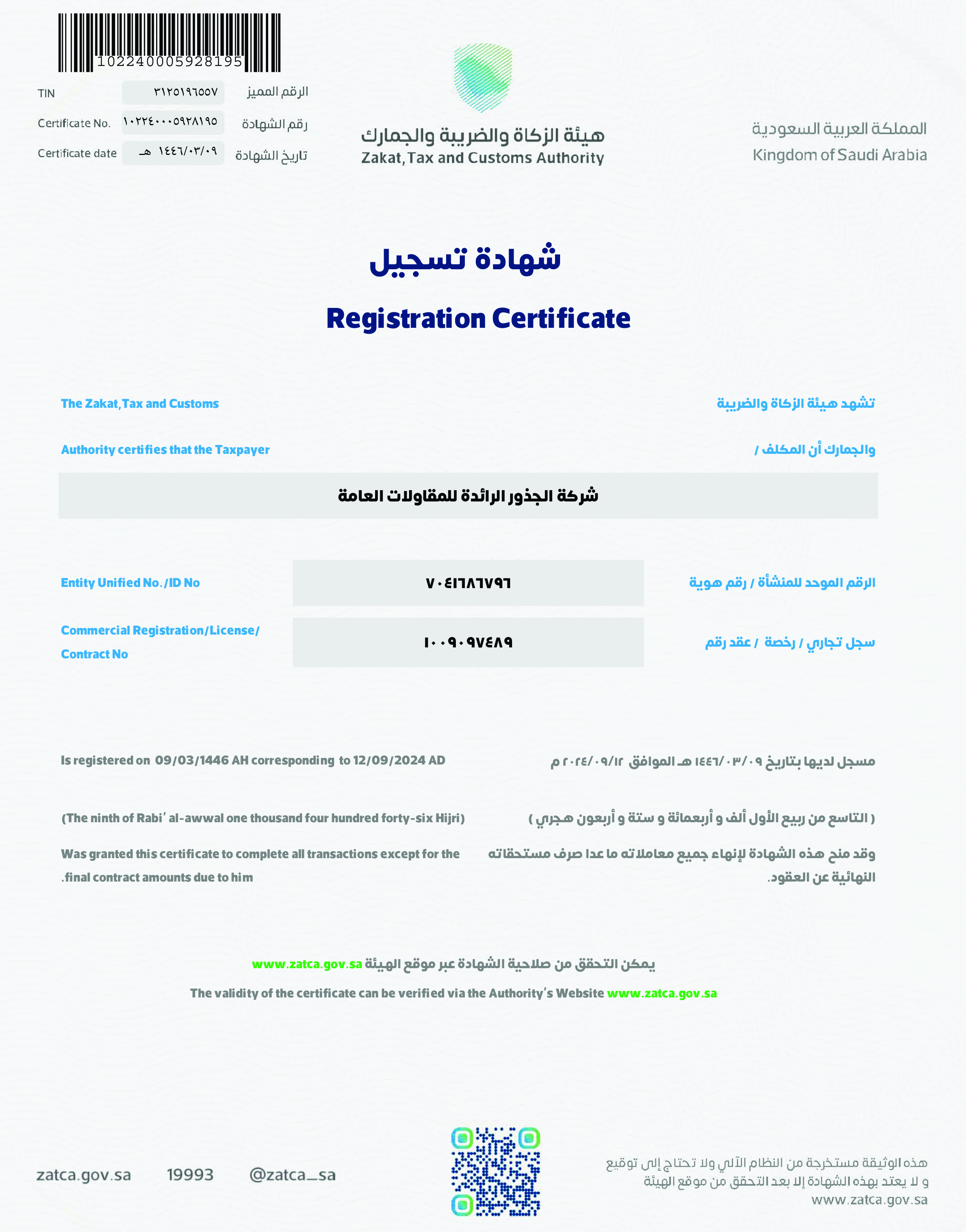 نحن في الجذور الرائدة للمقاولات نؤمن بأن النجاح يبدأ من الجذور، ولهذا حرصنا على أن تكون انطلاقتنا الجديدة قائمة على أسس راسخة وتجربة عملية واسعة، نترجمها إلى مشاريع تنموية تسهم في تحقيق تطلعات الوطن والمجتمع.